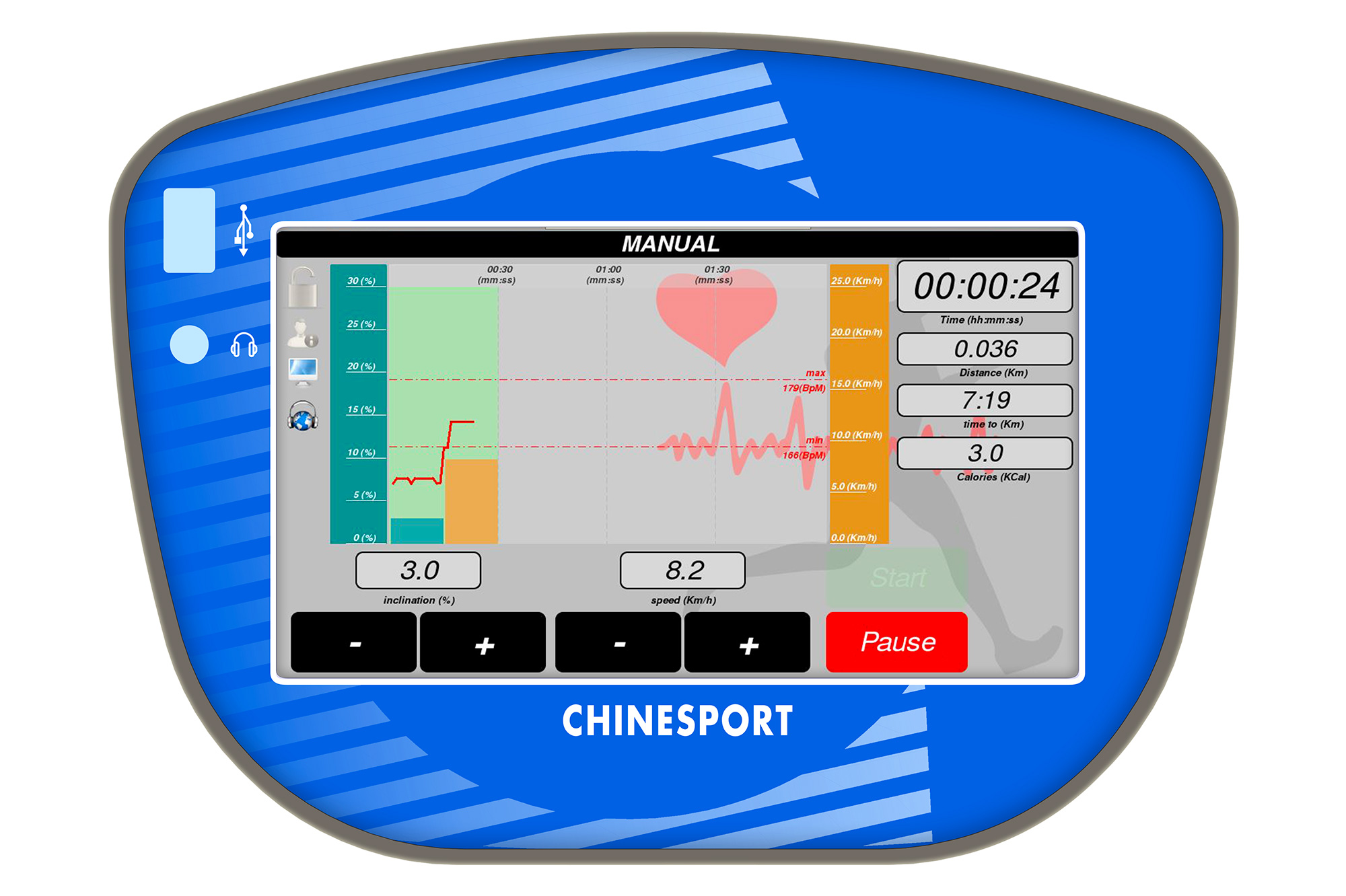 Можна збільшити або зменшити нахил в діапазоні ±1% або ±0,5%. Максимальний нахил в позитивному напрямку становить +22%. Для лінійки RehaRunner01 можливий негативний нахил, але цю функцію необхідно вказати при замовленні пристрою. У цьому випадку негативний нахил може становити до -3%, а позитивний - до +19%.