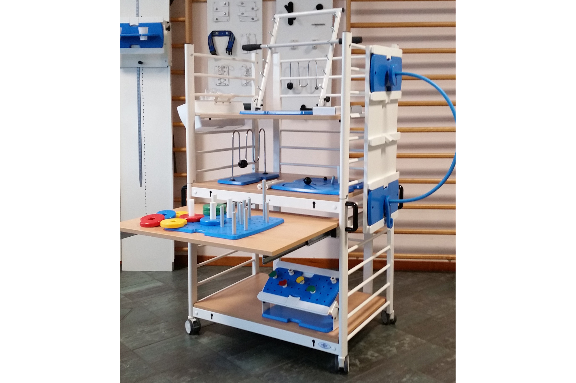 | Ergo mobile station | Цей візок можна використовувати як місце для зберігання різних допоміжних засобів, а також як мобільну робочу станцію. Конструкція виконана з металу з трьома дерев'яними полицями, має бічні ручки та поворотні коліщатка з індивідуальними гальмами. Центральна полиця регулюється по висоті. На конструкцію також можна встановити деякі аксесуари, які розширюють її використання, дозволяючи одночасно займати до чотирьох робочих позицій в положенні сидячи або стоячи. |