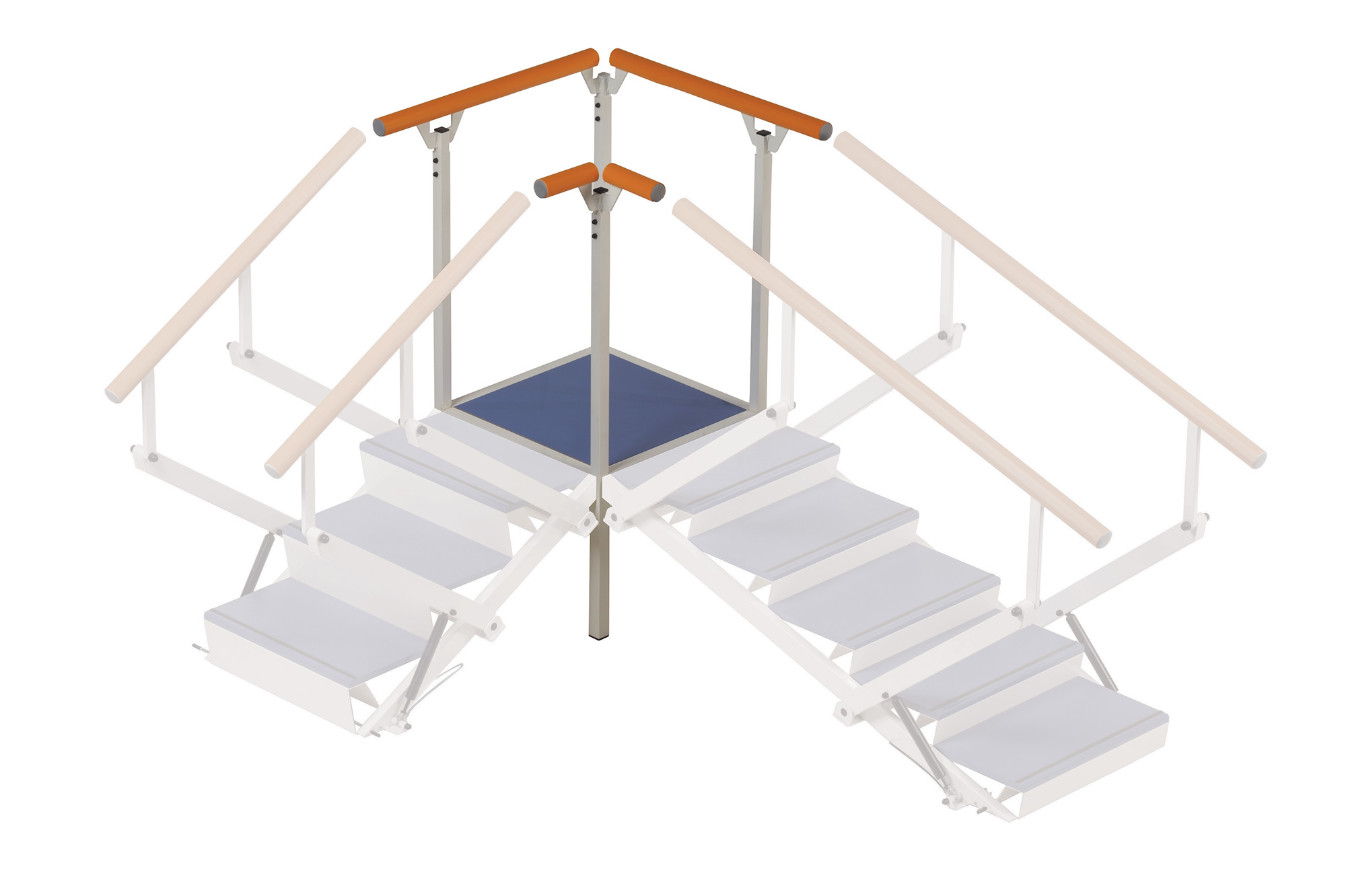 | Підніжка для 2-х кутових сходів. | Модуль, призначений для використання з двома сходами, які можна вибрати з трьох альтернатив: низькі або високі сходинки, або пандус. Утворюється кутова конструкція. У прогресивній терапевтичній фізичній культурі використання сходів для реабілітації спрямоване на реінтеграцію до дому та створення можливих складних ситуацій, які можуть виникнути у зовнішньому середовищі. | Конструктивні особливості | Програма реабілітації сходів використовує систему, що складається з набору піднятих платформ і сходів, виготовлених з пофарбованого сталевого каркасу, зі зносостійкими двошаровими дерев'яними сходинками і платформами, а також термопластичними нековзними поручнями. Всі деталі легко миються. | Безпека використання | Сходинки мають суцільну конструкцію із закругленими кутами та протектором, що полегшує постановку стопи. Крім того, сходинки мають вставку, яка зменшує ймовірність ковзання і водночас є надійною опорою під час ходьби. |
