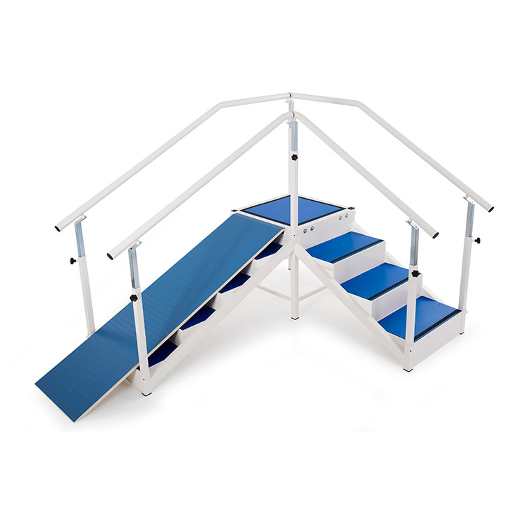 | Дерев'яний похилий пандус | Дерев'яний похилий пандус для реабілітаційних сходів з нековзним покриттям. Пандус сконструйований таким чином, що його можна легко встановити на сходи з чотирма сходинками, щоб створити нахил близько 20°, що імітує підйом і спуск. Пацієнт може використовувати регульовані поручні разом з пандусом, щоб забезпечити безпеку під час ходьби. |