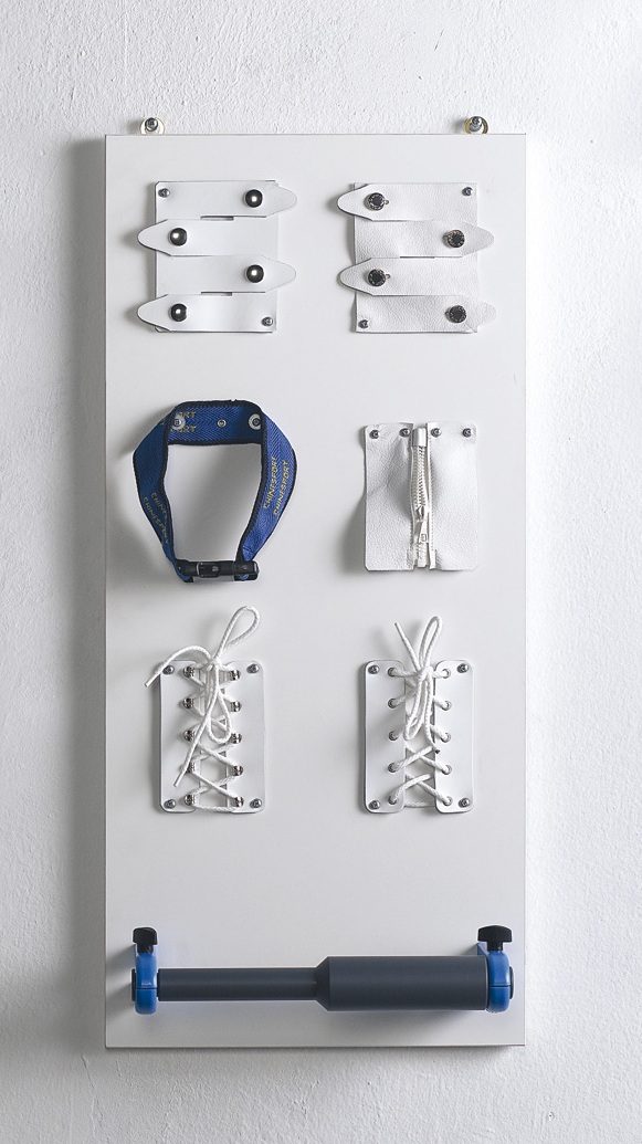 | Ergo 20 | Це настінна панель, яка оснащена бібліотекою з 7 допоміжних засобів для імітації повсякденних дій з перев'язування. Зокрема, конфігурована панель складається з наступних допоміжних засобів: Серія кнопок, Серія прес-шпильок, Серія горизонтальних шнурків, Серія перехресних шнурків, Пряжка з швидкознімним регульованим поясом, Комплект застібки-блискавки, Черв'ячний гвинт з регульованим опором. |